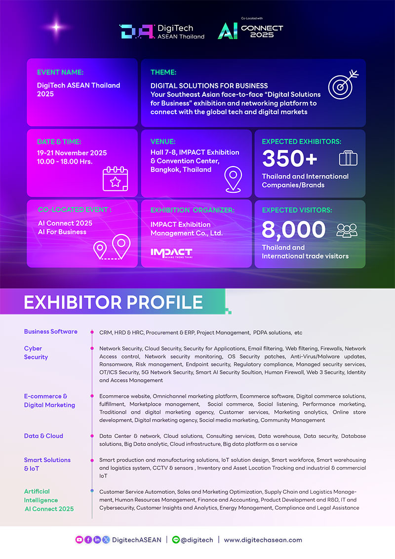 #DigiTechASEAN2025 #AIConnect2025 #ASEANTechInnovation #DigitalTransformation #TechnologyExhibition #ThailandTechEvents #GlobalTechPlatform #InnovationForBusiness #TechForFuture #ThailandDigitechEvent #DigitalSolutions