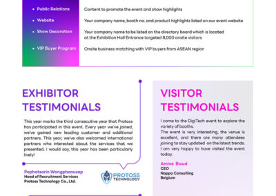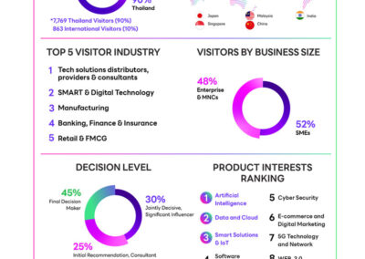 ကမ္ဘာတစ်ဝန်းမှ ဒစ်ဂျစ်တယ် နည်းပညာ အမှတ်တံဆိပ် ၃၅၀ ကျော် နှင့် တွေ့ဆုံကာ၊ သင်၏ လုပ်ငန်းအတွက် မိတ်ဖက်များ ရှာဖွေနိုင်ပြီး ဒေသတွင်း/နိုင်ငံတကာ အဆင့်အထိ စီးပွားရေး ကွန်ရက်ချဲ့ထွင်နိုင် ပါတယ်။