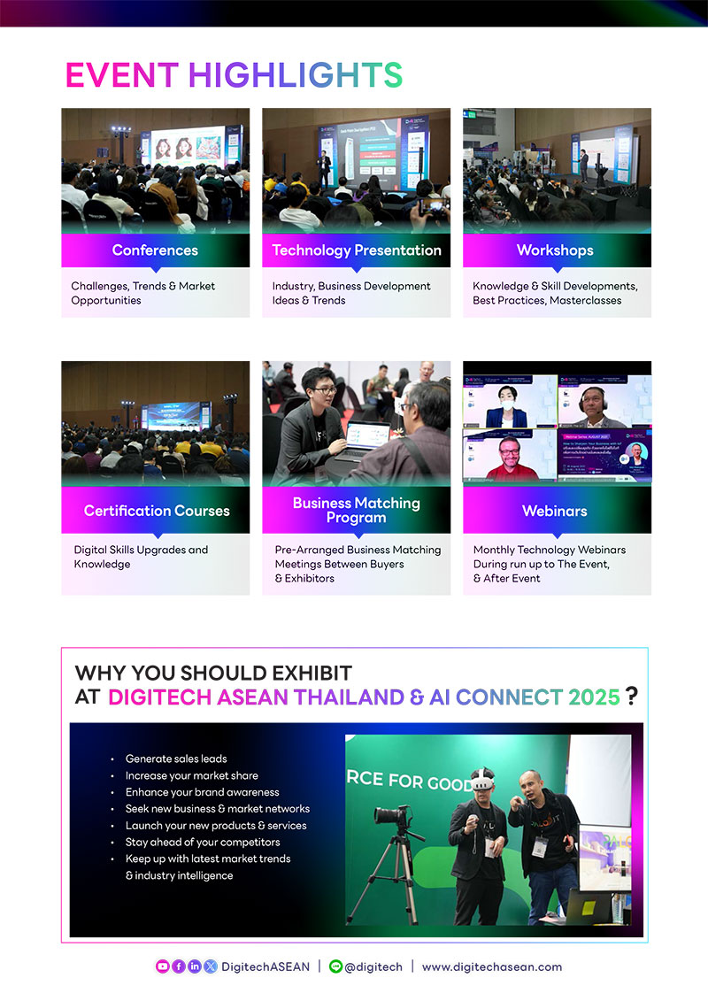 အထက်အကြောင်းအရာပါကိစ္စနှင့်ပတ်သက်၍ DigiTech ASEAN Thailand & AI Connect 2025 နည်းပညာပြပွဲကြီးဟာ ရက်သတ္တပတ် အနည်းငယ်အတွင်း ကျင်းပတော့မှာ ဖြစ်ပါတယ်။ နည်းပညာလုပ်ငန်းနယ်ပယ်မှ အဖွဲ့ဝင်များအနေဖြင့် ယခုပြပွဲမှ အကျိုးကျေးဇူးများစွာ ရရှိနိုင်မှာဖြစ်လို့ လာရောက်လေ့လာဖို့ ဖိတ်ခေါ်အပ်ပါတယ်ခင်ဗျာ။